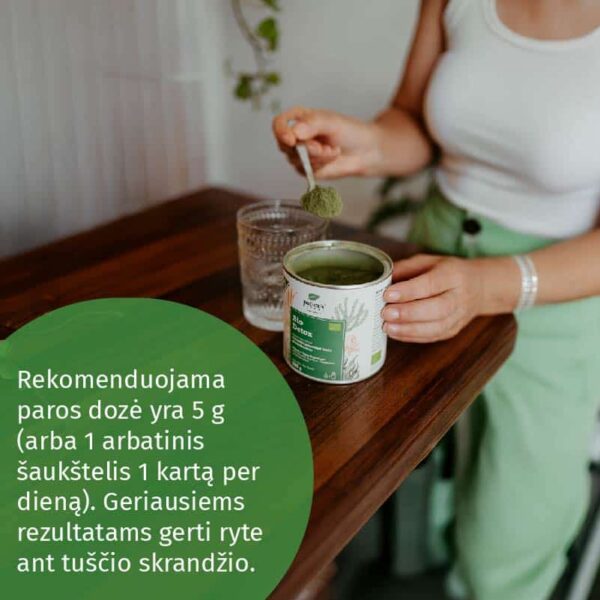 Rekomenduojama dienos dozė: 5 g (arba 1 arbatinis šaukštelis 1 kartą per dieną). Geriausiam rezultatui vartokite ryte tuščiu skrandžiu. Skoniui pagerinti galite sumaišyti su šviežiai spaustomis citrinų ar apelsinų sultimis arba su vandeniu.