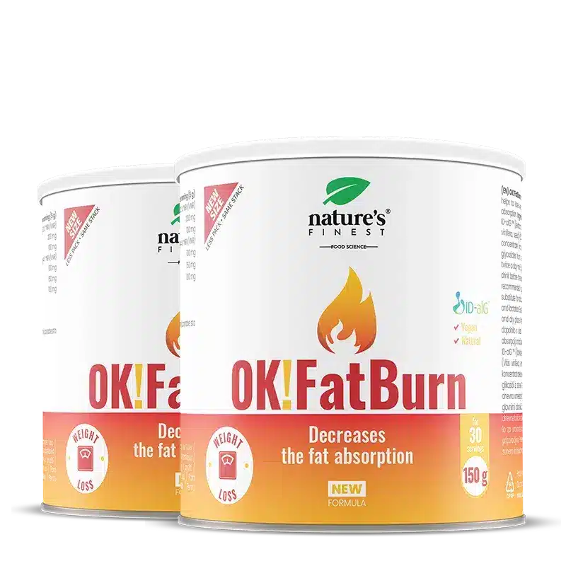 OK!FatBurn yra veiksminga lieknėjimo formulė, kuri, pasitelkdama ID-alG™, slopina angliavandenius ir riebalus skaidančius fermentus. Trigubas formulės poveikis padeda palaikyti normalią medžiagų apykaitą, kuri gamina energiją⁴, kartu su papildoma L-tirozino ir L-karnitino galia. Tyrimai patvirtina pastebimą svorio mažėjimą, susijusį su riebalų masės sumažėjimu.¹