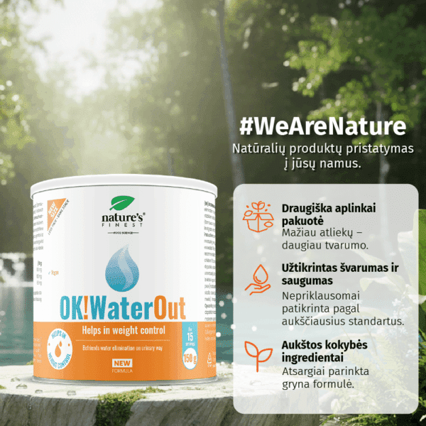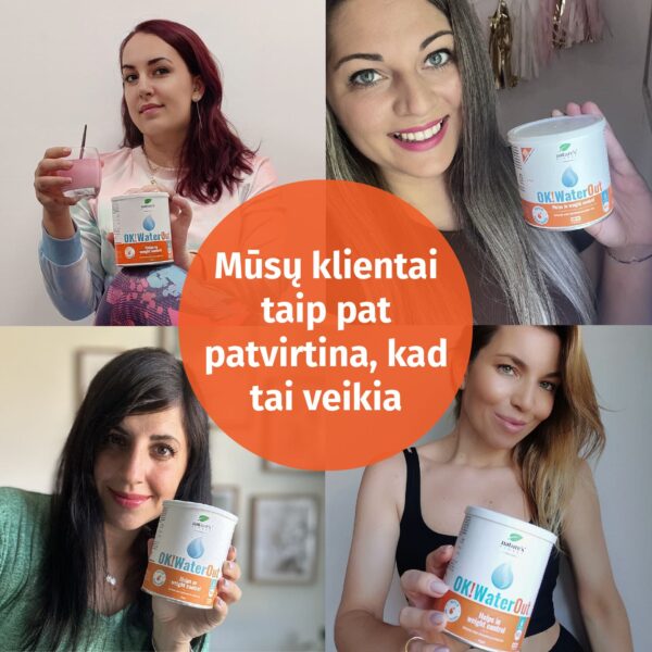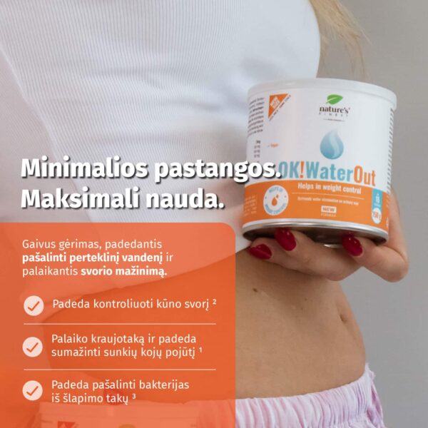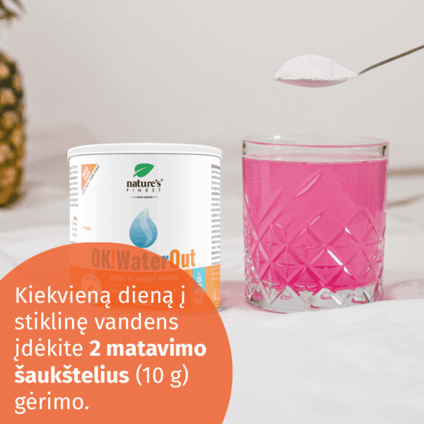 Kasdien į stiklinę vandens įberkite 2 samtelius (10 g) OK!WaterOut gėrimo. Viename samtelyje yra 100 mg dilgėlių ekstrakto, 100 mg šeivamedžio ekstrakto ir 50 mg mazgelinio serenčio ekstrakto.