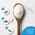 Malto dekstrinas, eritritolis, vitaminas C, mėlynių aromatas, stabilizatorius: celiuliozė, palmių ekstraktas, varunos žievės ekstraktas, dilgėlių ekstraktas, ženšenio ekstraktas, imbieras milteliuose, mėlynosios spirulinų ekstraktas, saldiklis: steviolio glikozidas, cinko glukonatas, natrio selenitas.